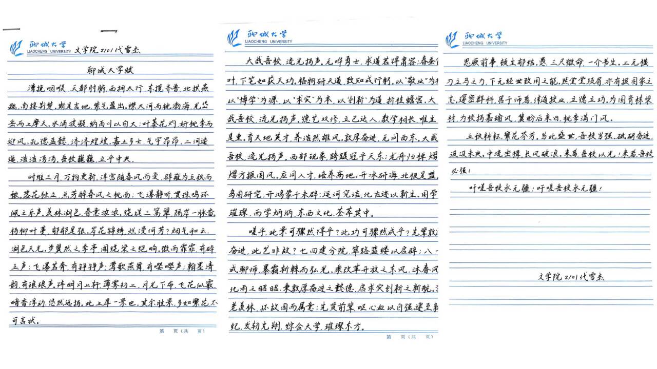 足球预测网 2021级1班代雪杰的《聊大颂》以赋体形式脱颖而出,意味隽永。他巧妙运用典雅的辞藻,将聊城大学的文化底蕴、精神内涵及辉煌成就融入字里行间,语言清新雅致,内涵深刻隽永,真挚表达出对聊城大学的热爱与崇敬。法学院2023级4班陈洁别出心裁,围绕青春回忆,讲述与母校共成长的感人故事,语言真挚动人。她在笔下写到,自己在聊城大学度过一段段美好时光,对此深感眷恋与感激。足球预测网 2021级3班吕欣洁深情回顾聊城大学建校五十年以来的辉煌历程,振奋人心。她巧妙融合校园美景、师生情感与历史变迁三部分内容,使读者跨越时空,身临其境,与有荣焉。教育科学学院2023级2班衣雪佳深入剖析聊大精神内涵,以严谨深刻的论述,深刻展现出聊大人敢于创新、勇攀高峰的奋进精神,情感真挚,令人动容。