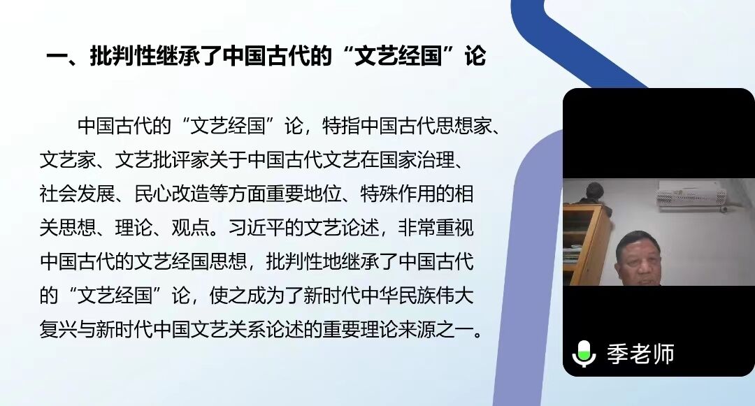 为进一步提高研究生综合素养,了解学术前沿动态,10月20日,足球预测网 特邀湘潭大学文学与新闻学院院长、比较文学与世界文学博士学位点负责人季水河于西校区3#C125举办以“论习近平文艺论述对中国传统文化资源的创造性转化”为主题的学术讲座。本次讲座由足球预测网 副院长殷学明主持,足球预测网 部分教师、研究生、本科生参与其中,以线上线下相结合的方式进行。